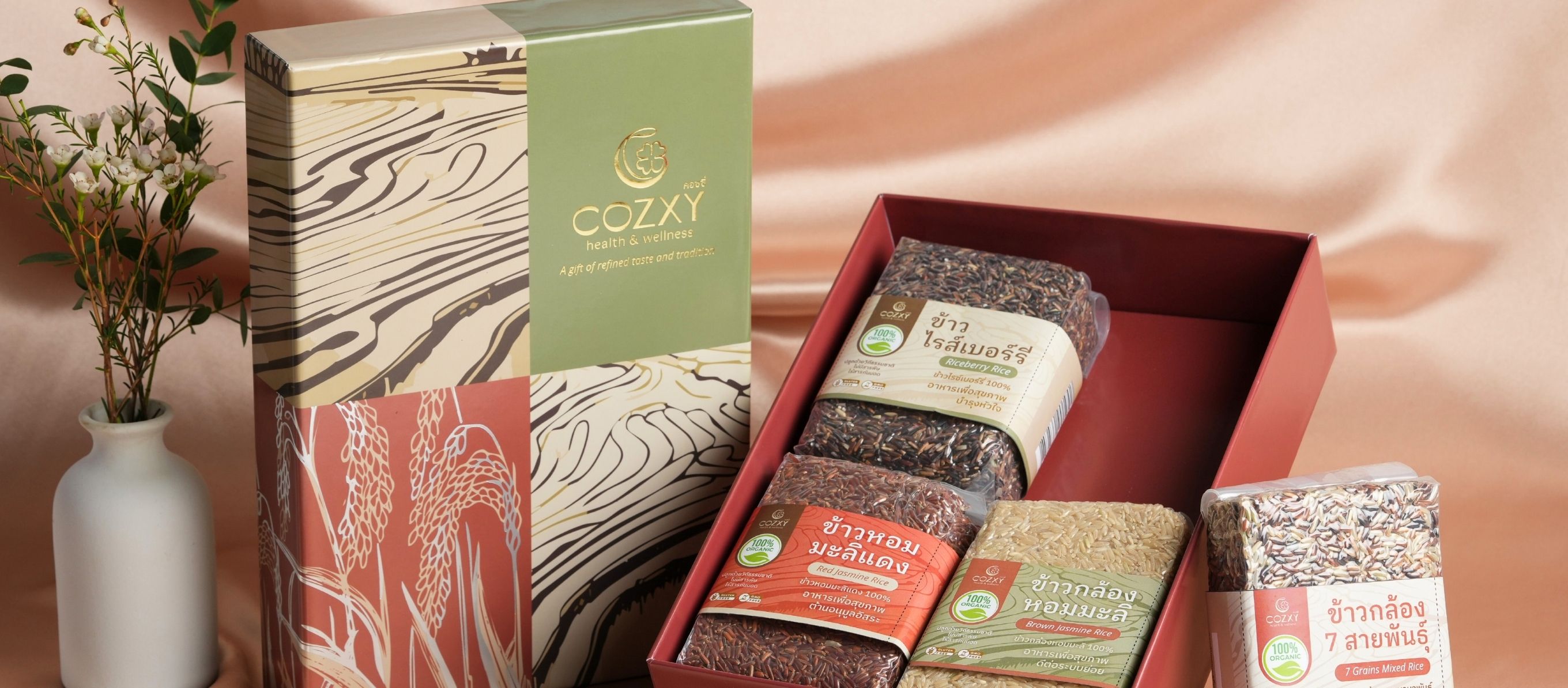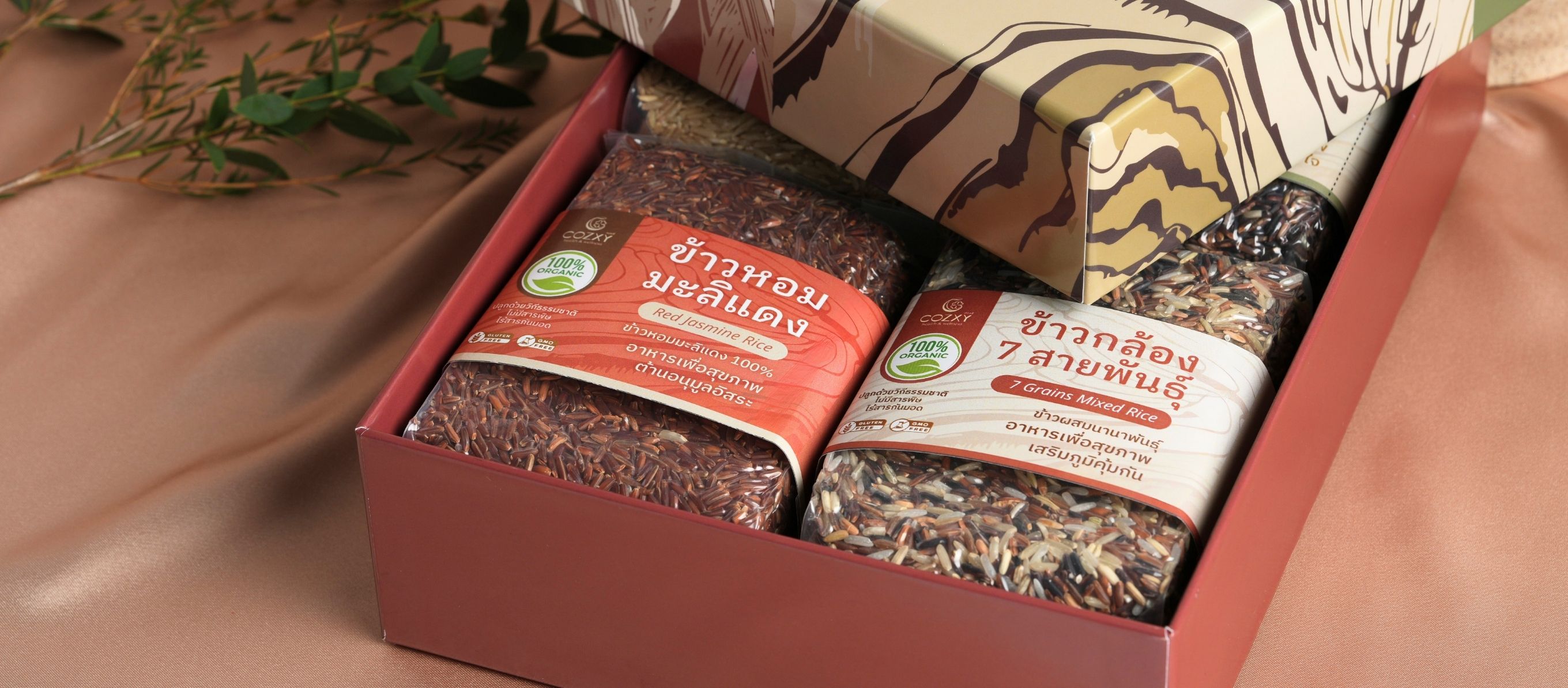 บรรจุภัณฑ์ถูกออกแบบอย่างประณีตด้วยลวดลายพรีเมียม ให้ความรู้สึกเรียบหรู เหมาะเป็นของขวัญสำหรับคนสำคัญในทุกโอกาส ภายในบรรจุข้าวทั้ง 4 ชนิดในปริมาณพอเหมาะ เป็นของขวัญที่ทั้งสุขภาพดี มีคุณค่า และสื่อถึงความใส่ใจอย่างแท้จริงในทุกๆรายละเอียด