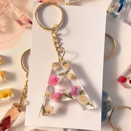 พวงกุญแจตัวอักษร ประดับด้วยดอกไม้โทนสีฟ้า สามารถระบุตัวอักษรที่ต้องการได้