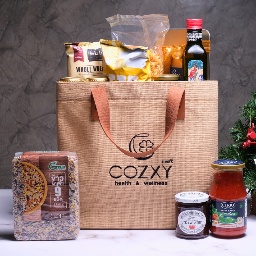 Cozxy Classic Tea Blend 20กรัม*3 กระปุก, อัลมอนด์ชิปส์ ขนมคลีน แคลต่ำ ไม่ทอด Almond Chips, Whole Wheat Chips ซองเล็ก 30 กรัม, Organic Chickpea Fusilli Pasta #Gluten Free# 250g*2, Extra virgin Olive oil 250ml, Apple Cider Vinegar 250ml, Pasta Sauce with Basil 420g, Pesto Sauce 190g, โกโก้นิบส์เคลือบคาราเมล I Golden Caramelised Cacao Nibs, Dr.Green ข้าวรวมธัญพืช 9 ชนิด (9 Kinds of Grains) 1 กก, Strawberry Reduced Sugar 200g, Cozxy Gift Bag และริบบิ้นตกแต่งสวยงาม