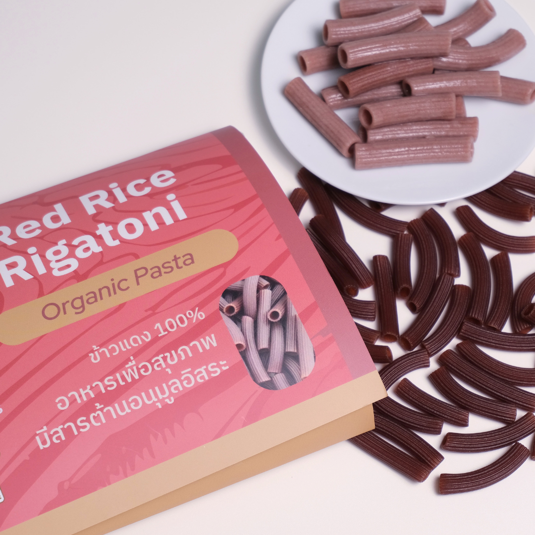 - Red Rice Rigatoni ที่ทำจากข้าวแดงออร์แกนิก ให้สีสันสวยงามตามธรรมชาติ และโดดเด่นด้วยคุณค่าจากสารต้านอนุมูลอิสระ เหมาะสำหรับเมนูซอสเข้มข้น เส้นหนึบ