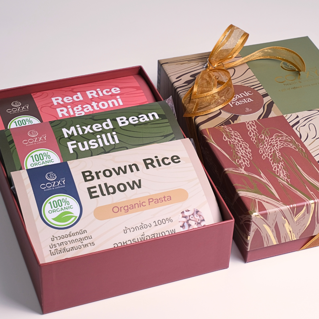 Organic Pasta Gift Set เซ็ตพาสต้าออร์แกนิกเพื่อสุขภาพที่รวมพาสต้า 3 ชนิดไว้ในกล่องเดียว ได้แก่ Red Rice Rigatoni, Brown ... Rice Elbow และ Mixed Bean Fusilli คัดสรรจากวัตถุดิบคุณภาพดี ปราศจากกลูเตน และมีโปรตีนสูง ตอบโจทย์ผู้ที่ใส่ใจสุขภาพในทุกมื้ออาหาร มาในแพ็กเกจพรีเมียมที่พร้อมมอบเป็นของขวัญให้คนสำคัญได้อย่างลงตัว
